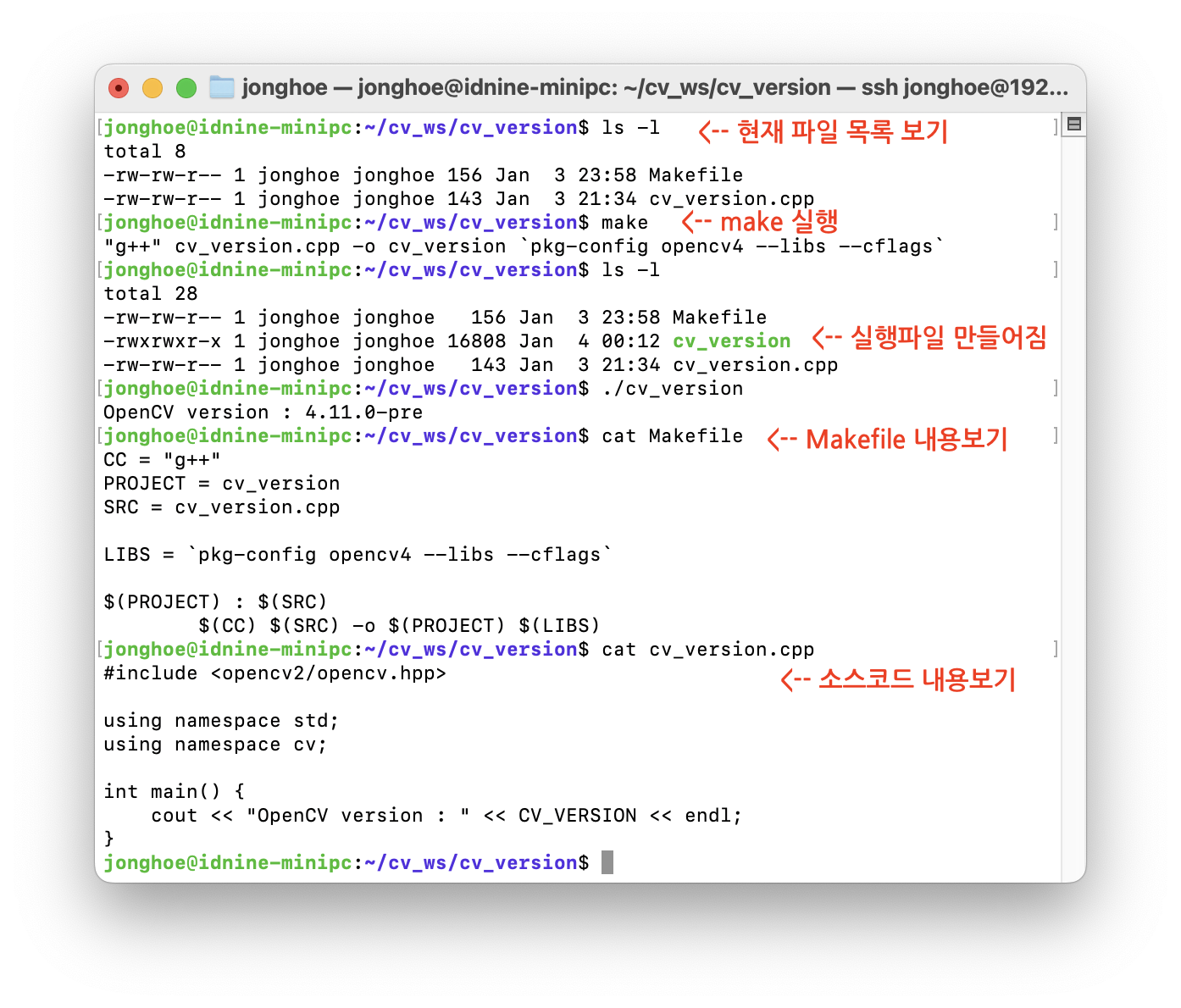 소스코드인 cv_version.cpp 와 Makefile 을 같은 폴더에 넣고, 해당 폴더로 가서 작업한다.