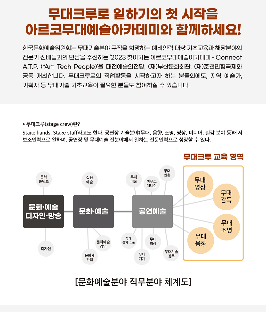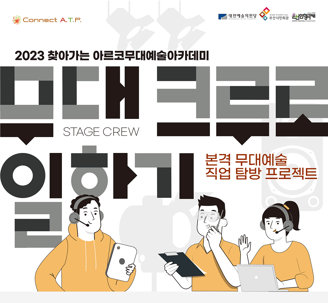 대상 : 무대기술분야 입직 희망자 및 예비인력, 기초교육이 필요한 종사자, 지역 내 거점 고등학교, 대학, 예술단체, 기획자모집인원 : 100명 이내