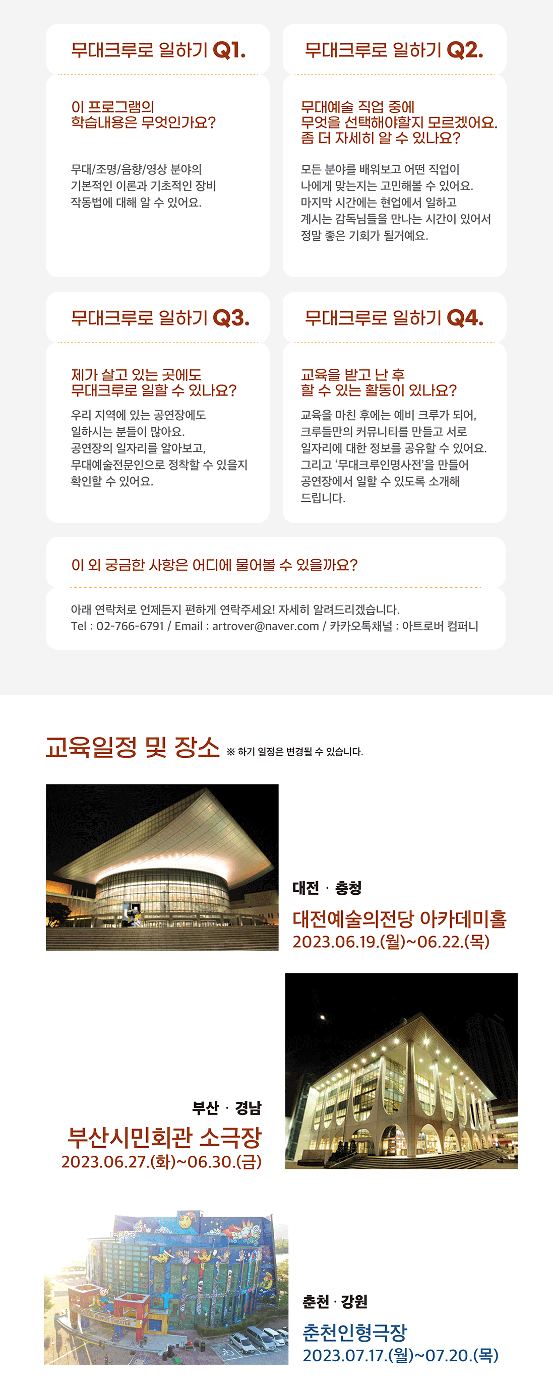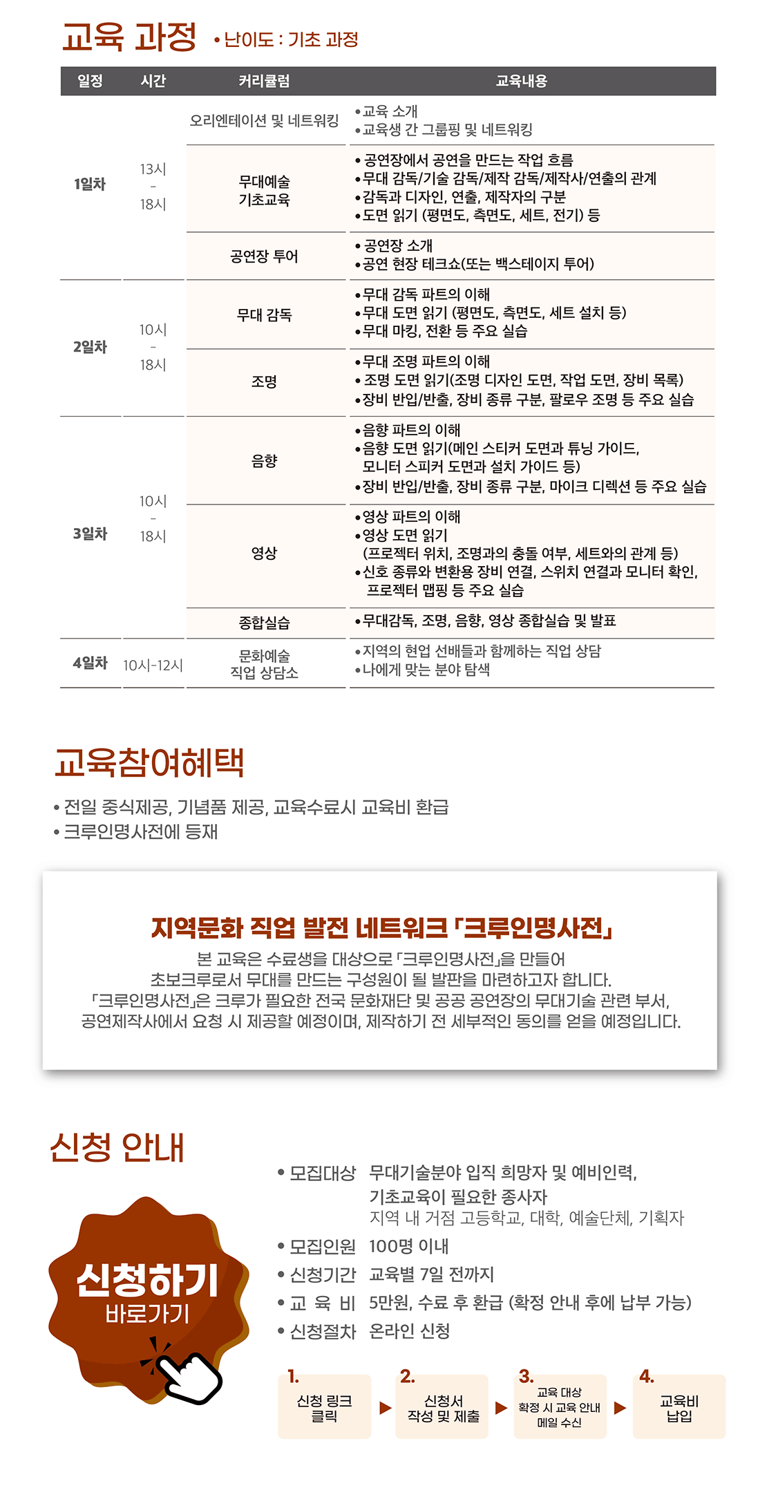 대상 : 무대기술분야 입직 희망자 및 예비인력, 기초교육이 필요한 종사자, 지역 내 거점 고등학교, 대학, 예술단체, 기획자모집인원 : 100명 이내