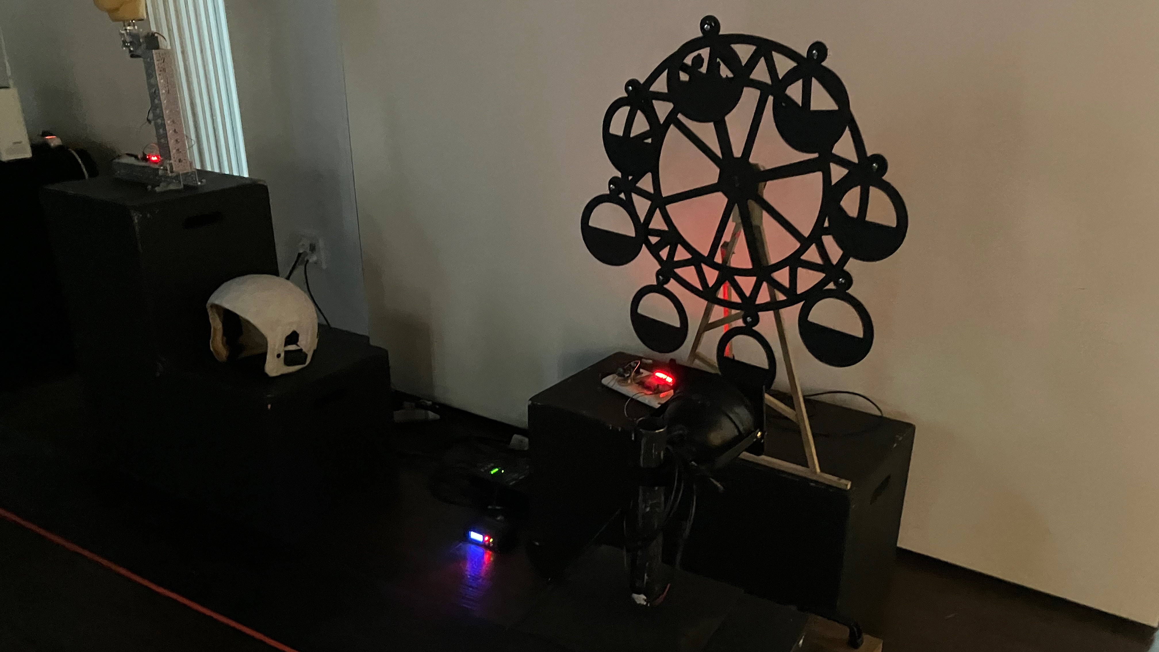 대관람차, 조명이 켜지고 모터가 돌면 뒤에 있는 흰 벽에 그림자가 나타난다.